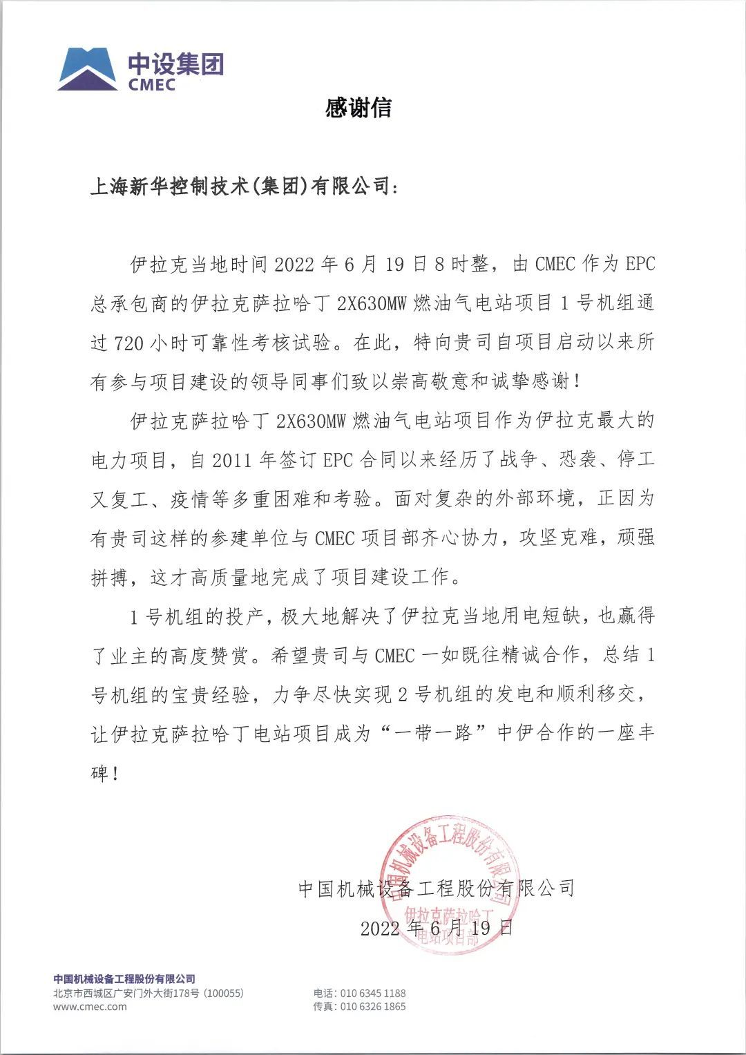 6月20日上午,新华科技收到该项目总包方CMEC的感谢信,信中对新华科技项目团队强烈的责任心、顽强拼搏的精神、扎实的业务能力表示肯定。