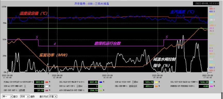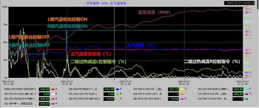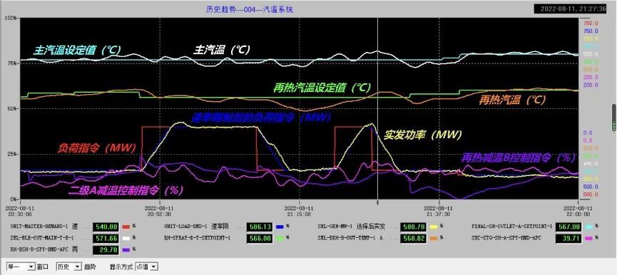 某650MW超临界机组,采用模型自适应控制等智能优化技术后,在连续反向变负荷指令下,过热汽温控制在±4.6℃,再热汽温控制±3℃;后续增加汽水分离器出口焓值优化后,控制品质还可进一步提升。