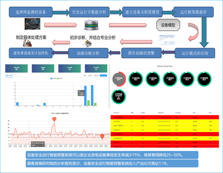 智能预警系统根据电厂静设备、动设备的运行特性,基于大数据分析的置信度逼近理论,建立设备运行关联度模型,实现生产关键环节设备的状态在线监测、潜在故障的智能预警、故障诊断分析,以及检修和运行的辅助决策支持。